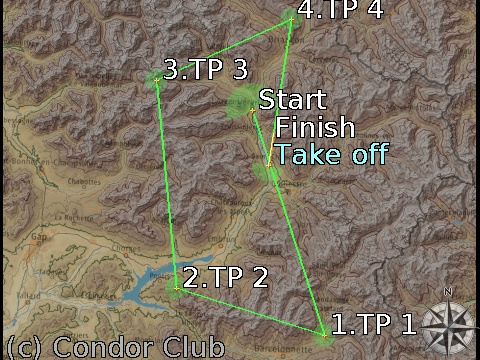 Coords: 44.56.545N / 6.38.620E Classic turnpoint, min. height: 0 m., max.: 10,000 m. angle: 360°, radius: 900 m. |  | | Finish: | St-Crepin (902 m.) Heading: 192° for 27.1 km,