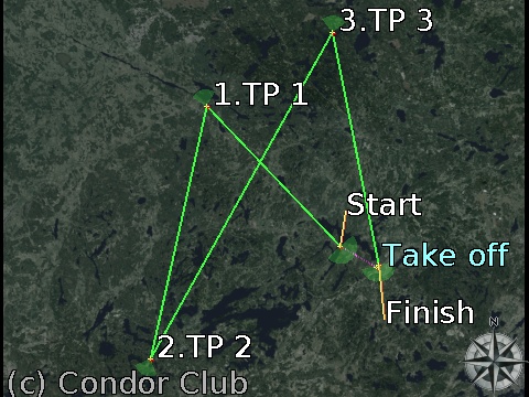 Coords: 60.21.700N / 24.10.217E Classic turnpoint, min. height: 1,000 m., max.: 1,500 m. angle: 180°, radius: 3,000 m. |  | TP 1: | Somerniemi (90 m.) Heading: 316° for 33.5 km,