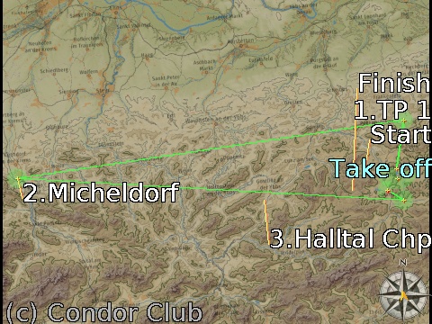 Coords: 47.52.307N / 14.7.518E Classic turnpoint, min. height: 0 m., max.: 5,000 m. angle: 360°, radius: 500 m. |  | TP 3: | Halltal Chp (786 m.) Heading: 95° for 92.6 km,