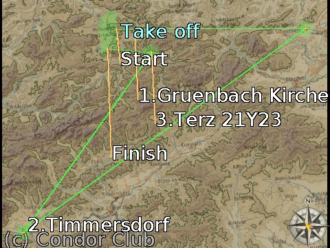 Coords: 47.50.1N / 15.20.208E Classic turnpoint, min. height: 0 m., max.: 2,500 m. angle: 180°, radius: 5,000 m. |  | TP 1: | Gruenbach Kirche (554 m.) Heading: 90° for 49.0 km,