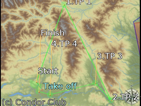 Coords: 47.13.236N / 14.34.195E Classic turnpoint, min. height: 0 m., max.: 6,000 m. angle: 360°, radius: 500 m. | TP 2: | Dravograd Mostov (328 m.) Heading: 150° for 78.4 km,