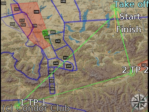 Coords: 47.55.274N / 13.54.30E Classic turnpoint, min. height: 0 m., max.: 1,700 m. angle: 180°, radius: 3,000 m. |  | | TP 1: | Zell-am-See (754 m.) Heading: 226° for 109.1 km,