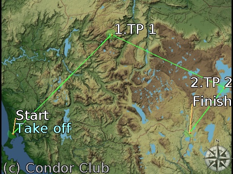 Coords: 41.39.371S / 145.58.437E Classic turnpoint, min. height: 0 m., max.: 10,000 m. angle: 360°, radius: 500 m. | TP 2: | Great Lake (1,034 m.) Heading: 119° for 70.4 km,