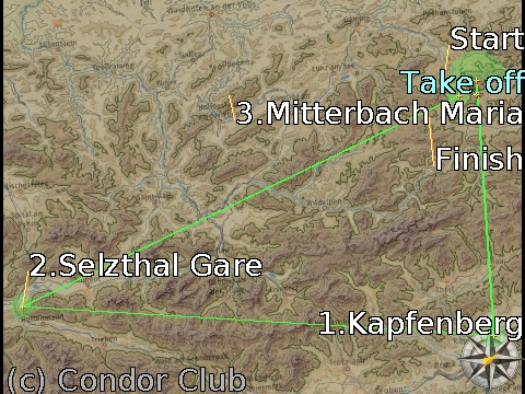 Coords: 47.50.1N / 15.20.208E Classic turnpoint, min. height: 0 m., max.: 2,500 m. angle: 180°, radius: 5,000 m. |  | TP 1: | Kapfenberg (514 m.) Heading: 174° for 41.9 km,