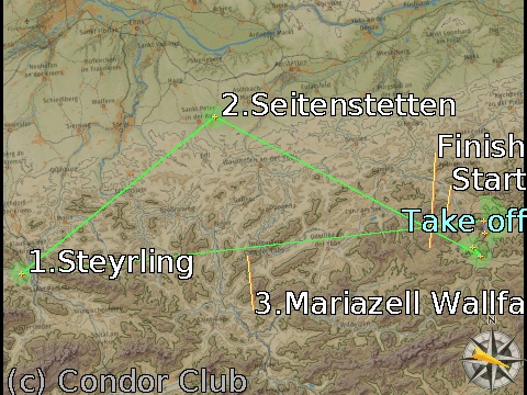 Coords: 47.50.1N / 15.20.208E Classic turnpoint, min. height: 0 m., max.: 2,500 m. angle: 180°, radius: 5,000 m. |  | TP 1: | Steyrling (520 m.) Heading: 261° for 90.2 km,