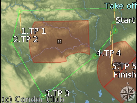 | Take off: | Take off (186 m.) Airport | Start: | Start Gate (230 m.) Heading: 279° for 5.4 km,